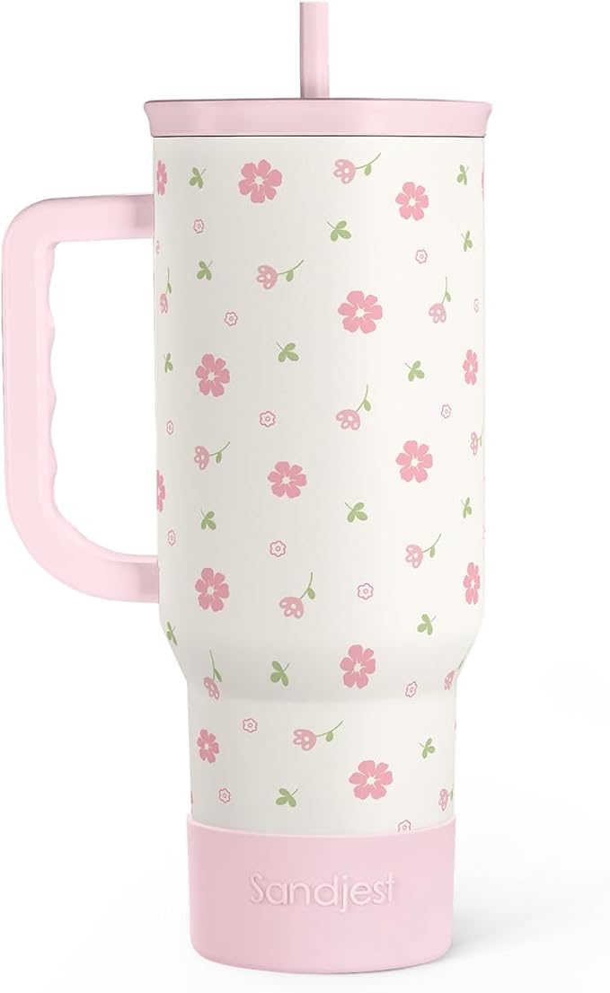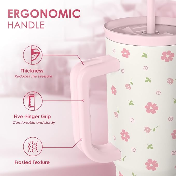 Tumbler with Handle and Straw – Flowers Insulated Stainless Steel Travel Coffee Mug for Women Girls – Gift Idea for Birthday Christmas Mothers Day